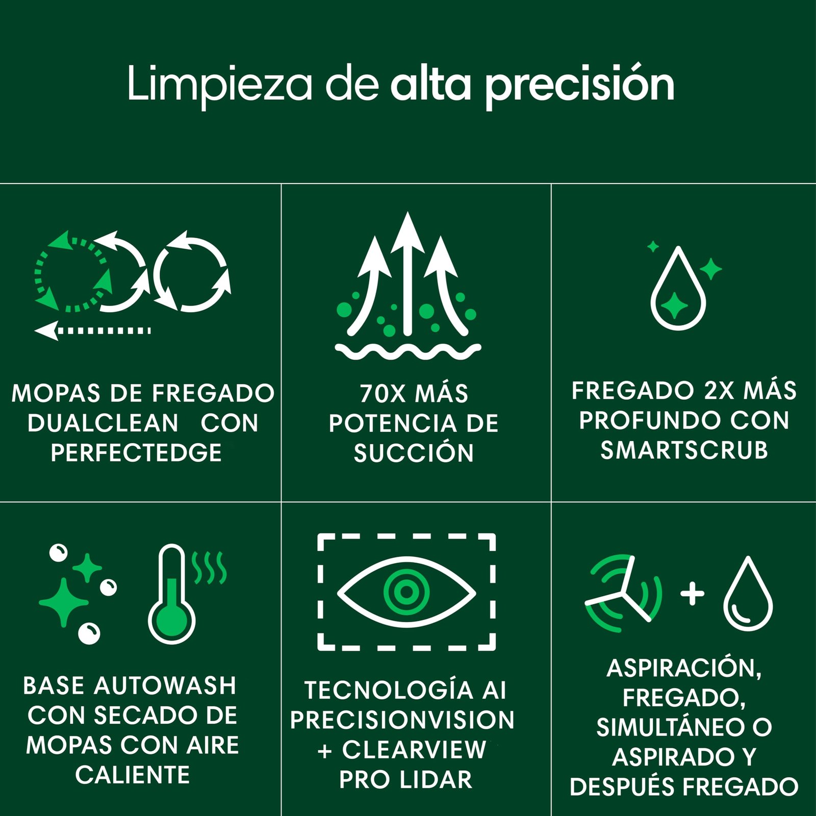 Cuenta con navegación ClearView Pro LiDAR para mapear el hogar con precisión y mejorar la cobertura de limpieza tanto de día como de noche. Además, la tecnología PrecisionVision con IA permite detectar y evitar obstáculos como cables, calcetines y otros objetos habituales, reduciendo interrupciones durante el funcionamiento y mejorando la movilidad en distintas estancias.