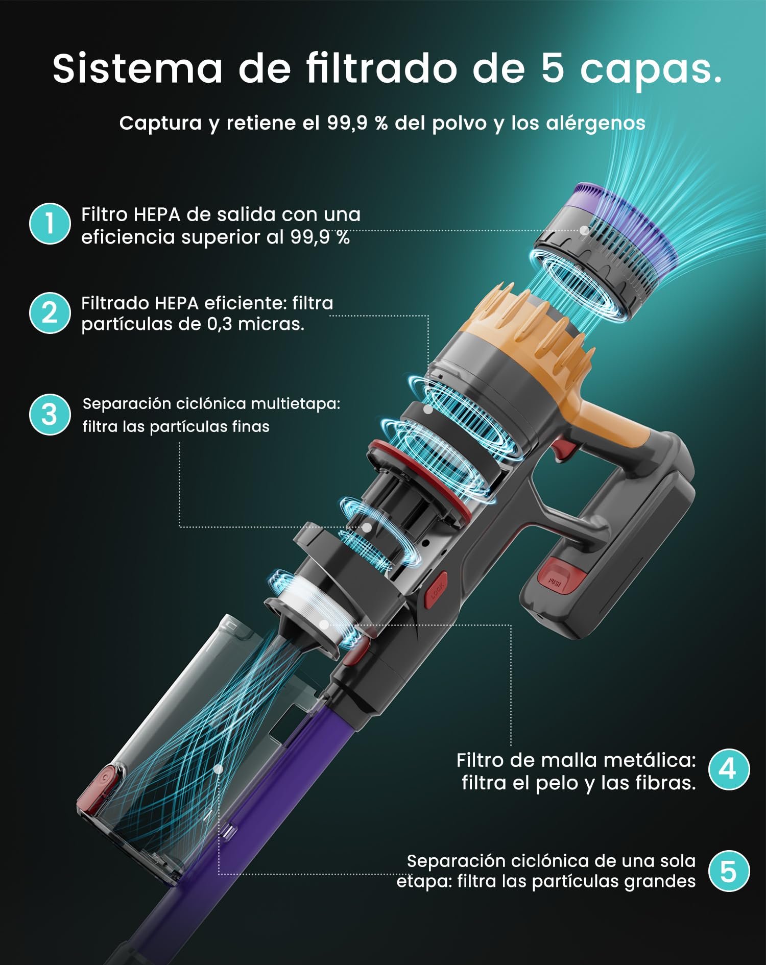 Cuenta con un sistema de filtración de 5 capas que ayuda a capturar partículas finas y polvo, contribuyendo a una limpieza más completa en el entorno doméstico. Dispone de 3 niveles de succión ajustables para adaptar la potencia según cada necesidad, ya sea para la limpieza diaria, alfombras o zonas con más suciedad.