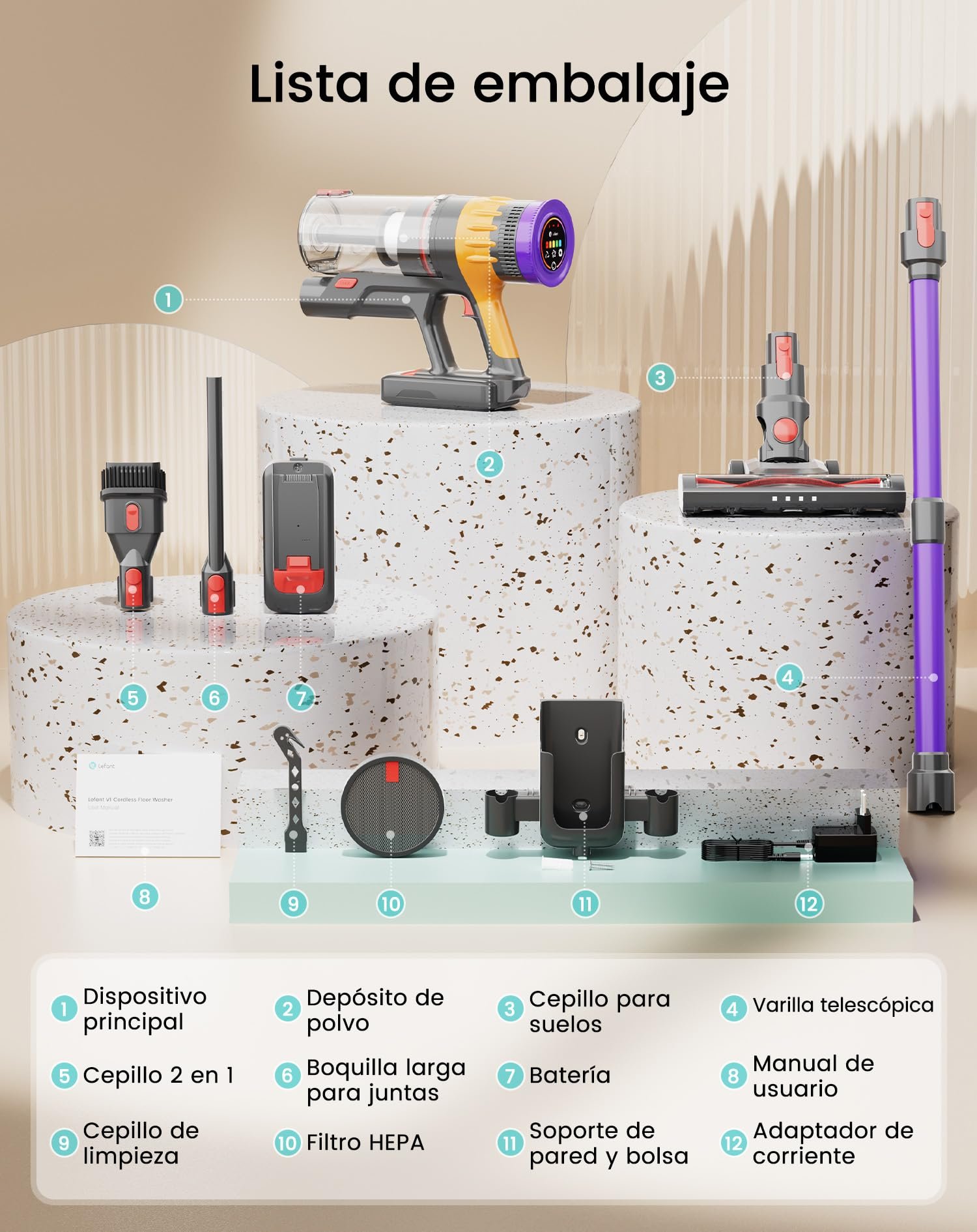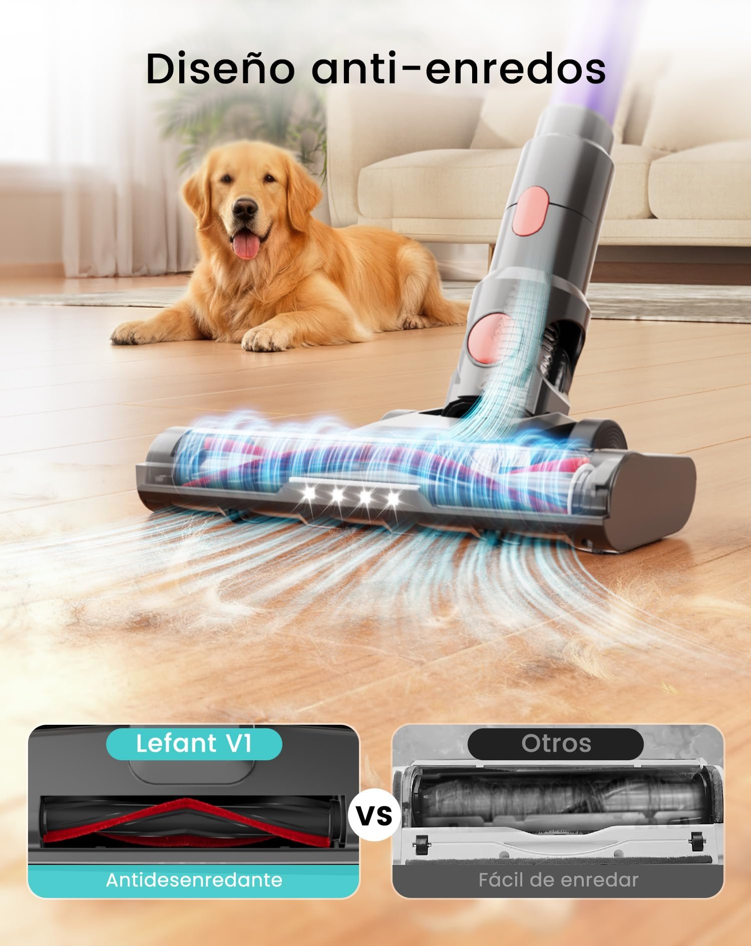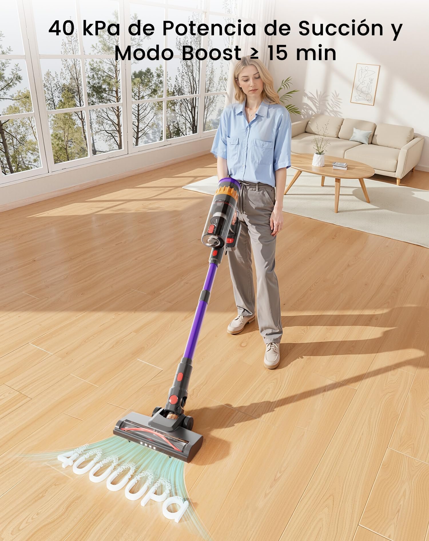 La LEFANT V1 es una aspiradora sin cable diseñada para ofrecer una limpieza práctica y eficiente en distintas zonas del hogar. Su potencia de succión de 40 KPa permite recoger polvo, migas, pelo de mascotas y residuos en suelos duros, alfombras, muebles y rincones de difícil acceso.