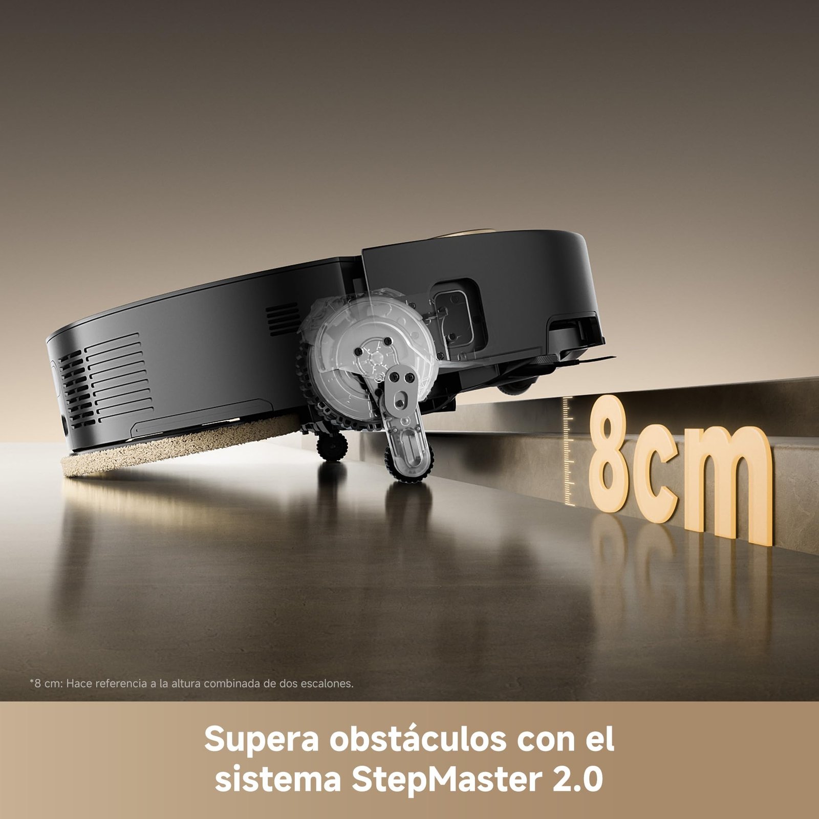 Su sistema StepMaster 2.0 permite superar obstáculos, umbrales y desniveles de hasta 8 cm, facilitando el desplazamiento entre distintas zonas del hogar. También dispone de navegación FlexScope con sensor retráctil, diseñada para mejorar el acceso debajo de muebles bajos y optimizar la planificación de rutas en espacios abiertos y reducidos.