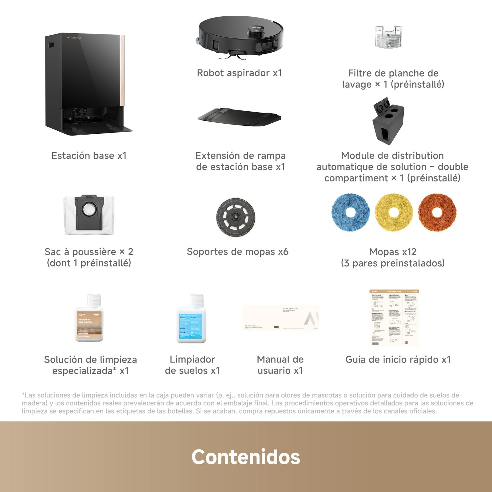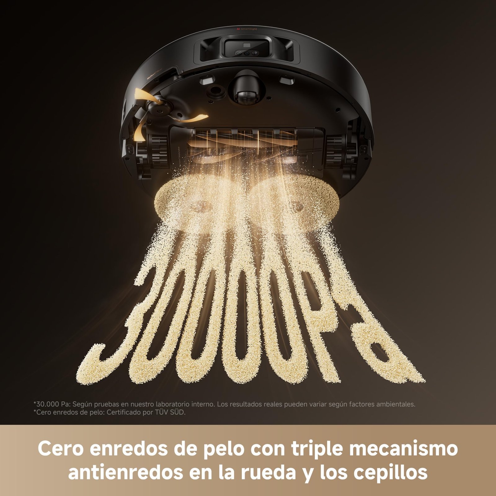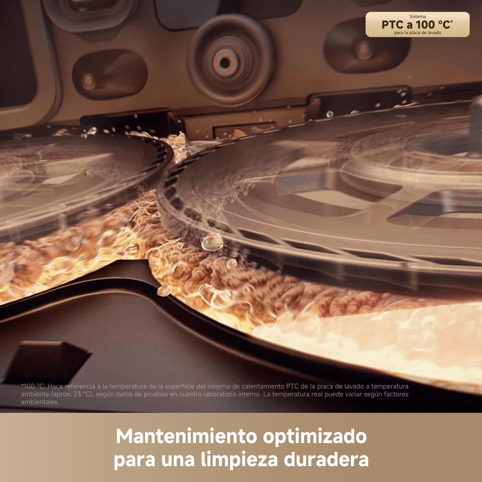 El sistema antienredos con doble cepillo está pensado para reducir la acumulación de pelo y facilitar el mantenimiento diario, especialmente en hogares con mascotas. La estación base automática completa la experiencia con funciones de rellenado, vaciado, lavado de mopas y recarga automática, además de sistema PTC a 100 °C para una limpieza más cómoda e higiénica.