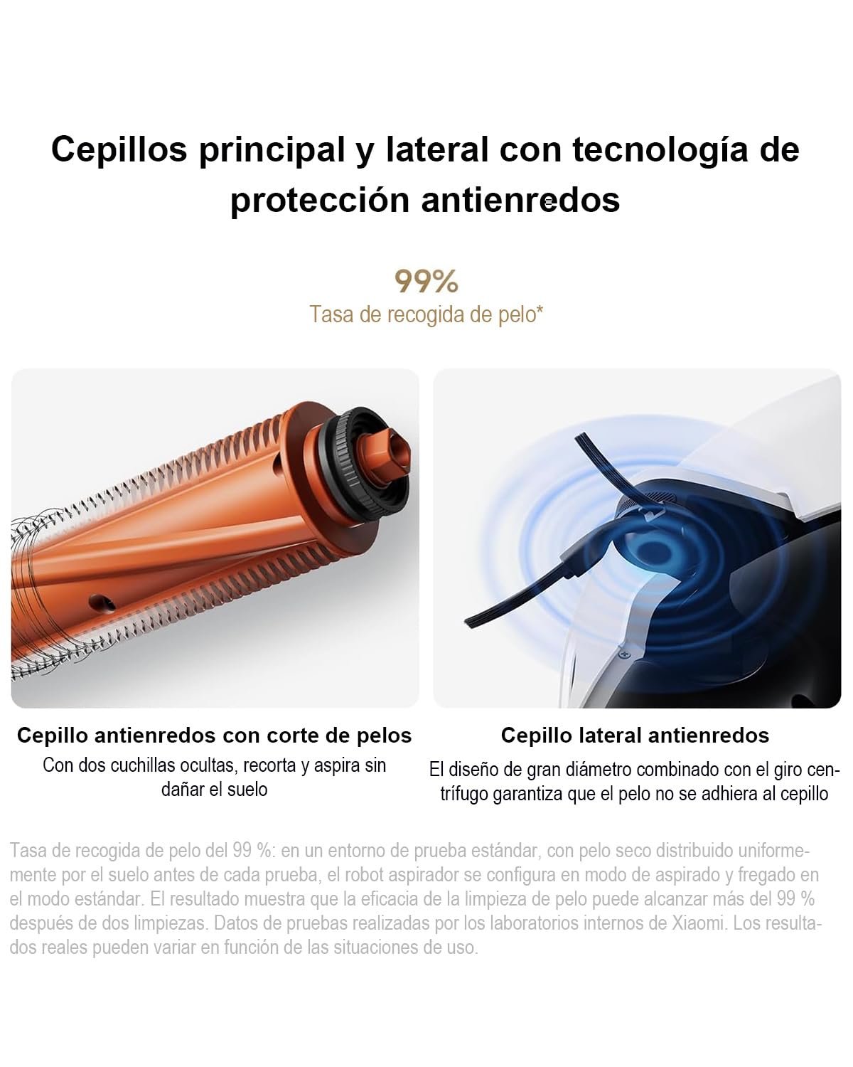 Su cepillo principal y cepillo lateral antienredos ayudan a reducir la acumulación de pelo y facilitan el mantenimiento diario. El cepillo lateral y la mopa extensibles mejoran la limpieza en esquinas, bordes y junto a las paredes, mientras que el sensor ultrasónico para alfombras eleva automáticamente la mopa para ayudar a mantenerlas secas.