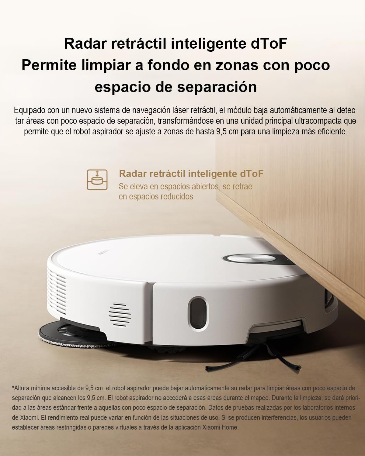 Cuenta con un sistema de radar láser dToF retráctil que facilita el acceso a espacios bajos, permitiendo limpiar debajo de muebles con mayor comodidad. Además, incorpora navegación precisa con sistema láser y detección inteligente de obstáculos para mejorar el recorrido y reducir interrupciones durante la limpieza.